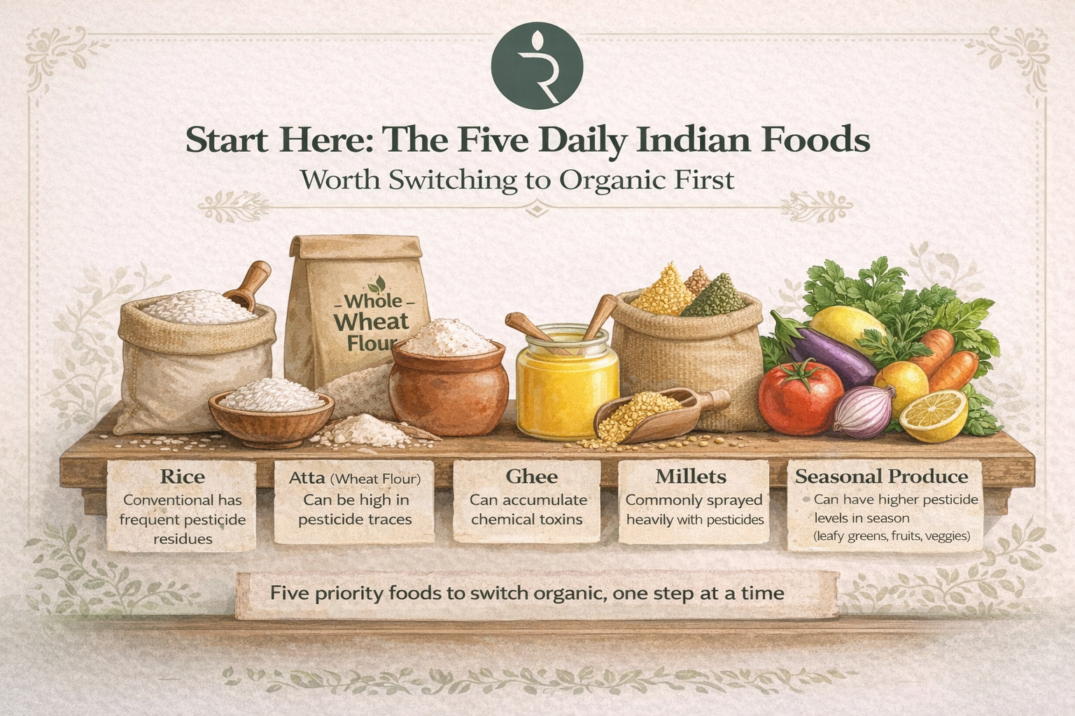 Not every food requires the same level of urgency when it comes to choosing organic. But for the foods that form the foundation of the daily Indian diet — the ones eaten every meal, every day — the case for organic is strongest and most impactful.