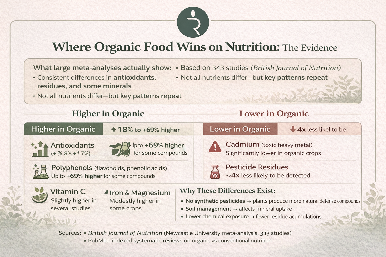 A landmark meta-analysis published in the British Journal of Nutrition, drawing on 343 peer-reviewed studies, found that organic crops contained 18 to 69 percent higher concentrations of antioxidant compounds, depending on the type of antioxidant. Researchers concluded that consumers who switch to organic fruit, vegetables, and cereals would get 20 to 40 percent more antioxidants. Tufts Health & Nutrition Letter