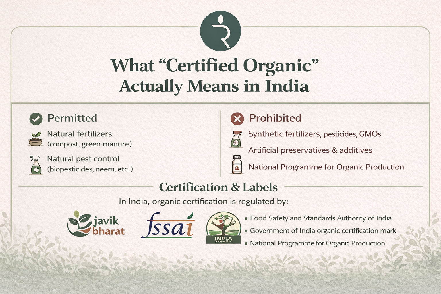 Organic food is grown and processed without the use of synthetic pesticides, chemical fertilisers, genetically modified organisms, or artificial post-harvest treatments. In India, this is governed by the Food Safety and Standards Authority of India (FSSAI) through the Jaivik Bharat programme, and by the National Programme for Organic Production (NPOP) administered by APEDA under the Ministry of Commerce. Certified organic food has been independently verified to meet these standards.