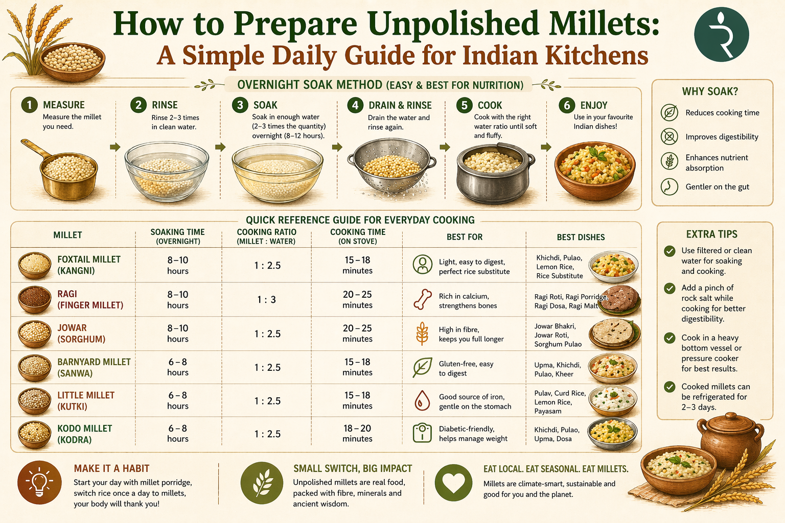Once soaked, they cook at roughly the same speed as rice. The textures are different from polished grain, nuttier, earthier, with more presence in the mouth and most people who make the switch find this difference becomes a preference within a few weeks. The ragi mudde, the foxtail millet khichdi, the jowar bhakri of traditional Indian cooking were all made from whole, unpolished grain. The soaking step is not an inconvenience added by modern health advice. It is simply how these grains were always prepared.