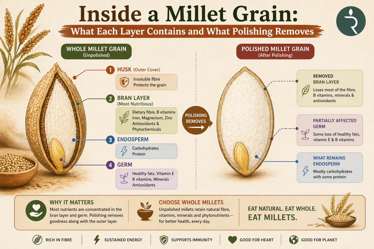 In short: the fibre, the minerals, the antioxidants, the slow-release carbohydrates that make millets genuinely different from rice and wheat…all of it lives in the bran. All of it goes when you polish.