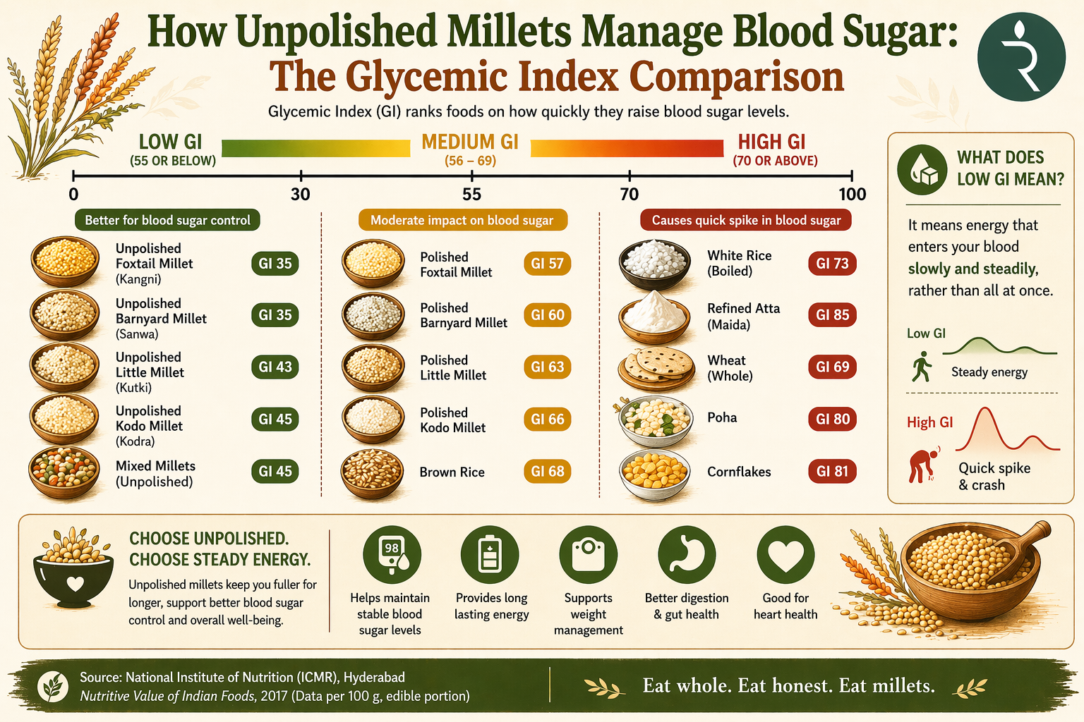 For families managing diabetes, pre-diabetes, or simply trying to avoid the blood sugar instability that characterises so much of modern Indian eating, the choice between polished and unpolished millets is not a preference. It is the entire point.
