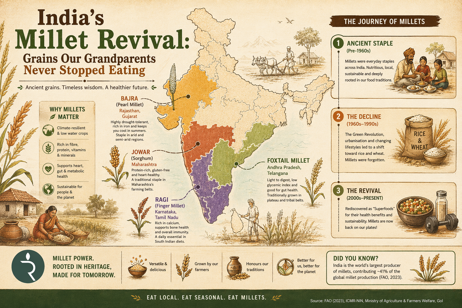 After decades of being quietly pushed aside by polished rice and refined wheat, millets are back. They are on restaurant menus in Mumbai and Chennai. They are in corporate lunch boxes in Bengaluru. They have been elevated to the status of a national food priority, with India championing the International Year of Millets in 2023. Ragi, jowar, bajra, foxtail millet, barnyard millet, little millet…grains that our grandparents ate out of necessity are now being sought out by a generation that has discovered, often after a health scare or a nutritionist's advice, that the oldest foods in Indian agriculture may also be the wisest.